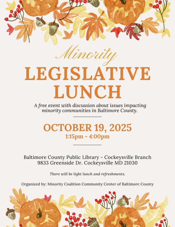 Join us for a discussion about issues impacting minority communities in Baltimore County. There will be light lunch and refreshments.